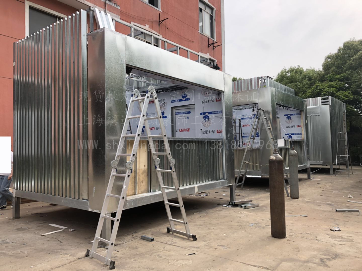 立柱采用100*100*2.5d鍍鋅方管焊接而成,整體鋼結(jié)構(gòu)骨架,抗震防風。外墻采用鍍鋅板折邊成型,內(nèi)搭3mm鋁塑板,吊頂為16mm金屬烤漆雕花板吊頂。